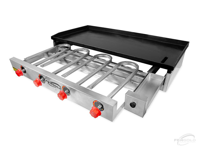 Chapa superior “Quente Fria”: Com área de 1000 x 500 mm e espessura de 5 mm com gaveta removível de resíduos. Não é antiaderente, no entanto, é mais resistente a temperatura