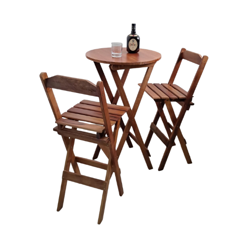 Produzido em madeira de alta qualidade, o conjunto conta com uma mesa redonda e duas cadeiras dobráveis, que garantem fácil transporte e armazenamento. Seu acabamento natural realça a beleza da madeira e traz um visual rústico e contemporâneo ao mesmo tempo.