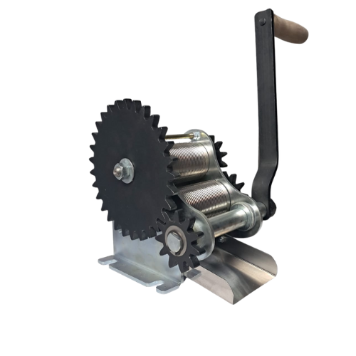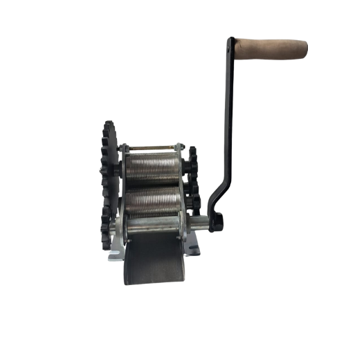 A manivela com cabo de madeira proporciona firmeza e conforto durante o uso, permitindo operação contínua sem esforço excessivo.